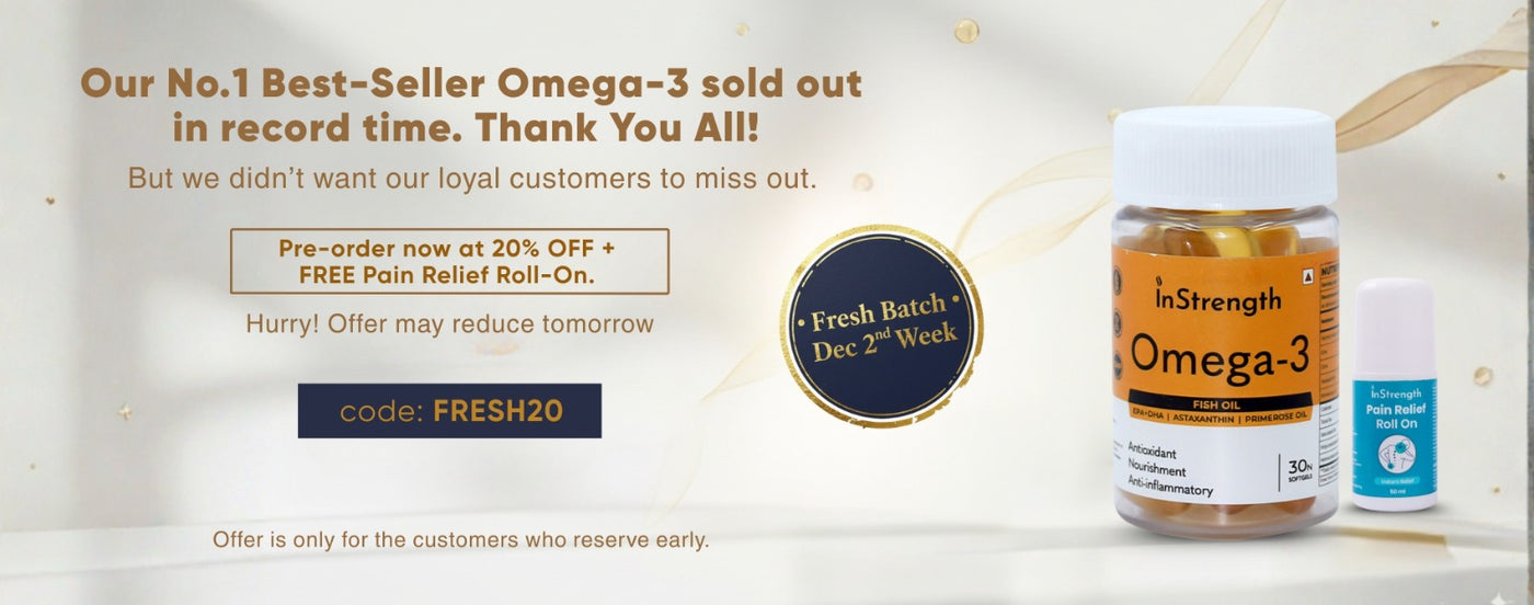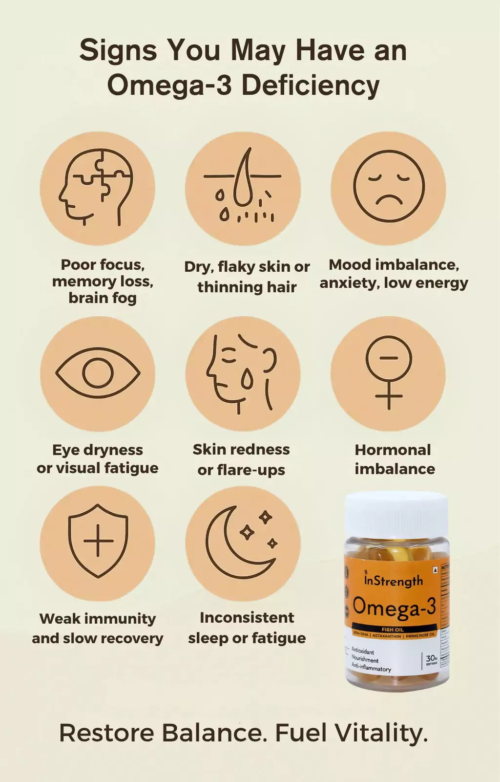 Take a step toward a healthier lifestyle with InStrength Omega-3 Capsules, a premium blend designed to complement your overall wellness. Sourced from high-quality salmon fish oil and enriched with Astaxanthin and Evening Primrose Oil, these Salmon Fish oil capsules deliver the nourishing benefits of Omega-3 fatty acids to support your daily health goals.