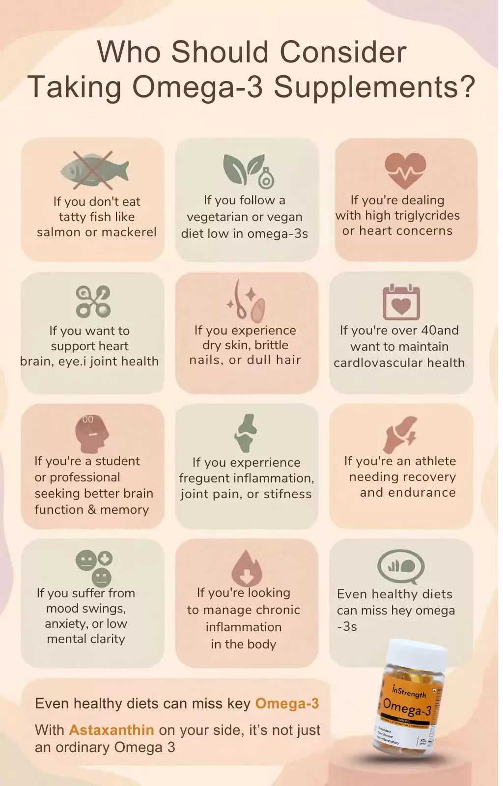 Unlike typical Omega-3 supplements, InStrength Omega-3 Capsules combine the power of EPA and DHA with Astaxanthin and Evening Primrose Oil. This unique blend ensures better nutrient absorption and provides additional antioxidant support for a well-rounded approach to wellness.