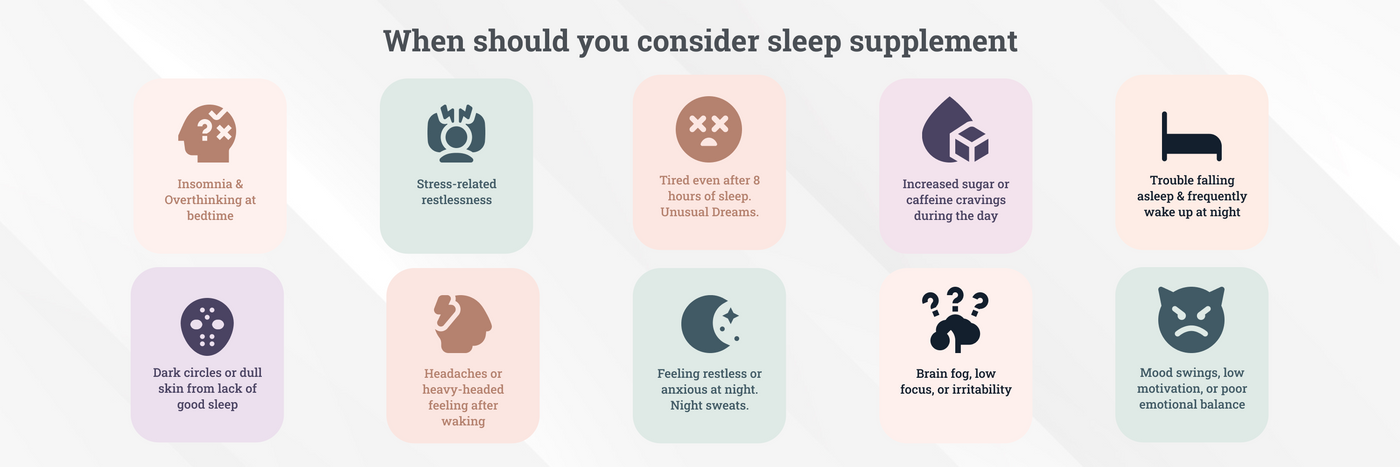 It's recommended to take sleep supplements about 30 minutes to an hour before bedtime to allow the ingredients to take effect.